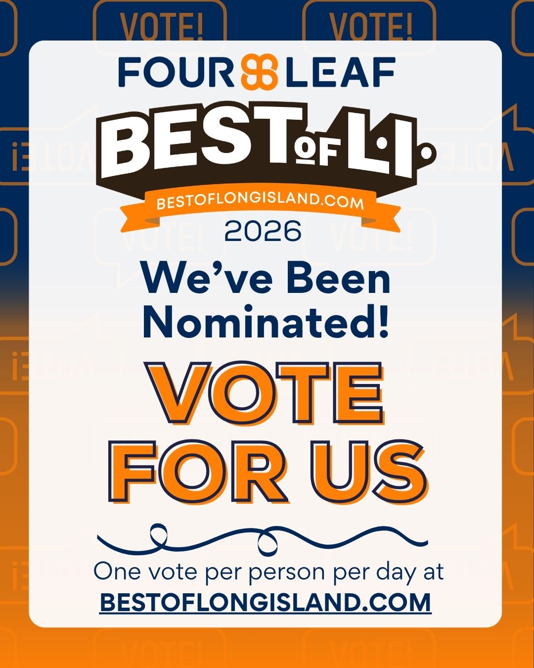 Voting starts October 1st - December 15th. You can vote once each day from each email address. Click the graphic to vote and tell your friends and family.